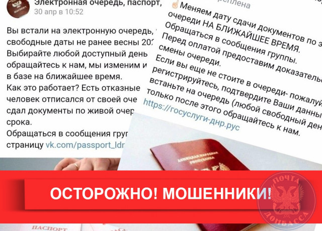 Государственное предприятие «Почта Донбасса» информирует граждан Донецкой Народной Республики об установленном факте деятельности мошеннической группы, предлагающей услуги выдачи талонов электронной очереди в Миграционную службу МВД ДНР для подачи документов на получение паспортов ДНР и РФ.