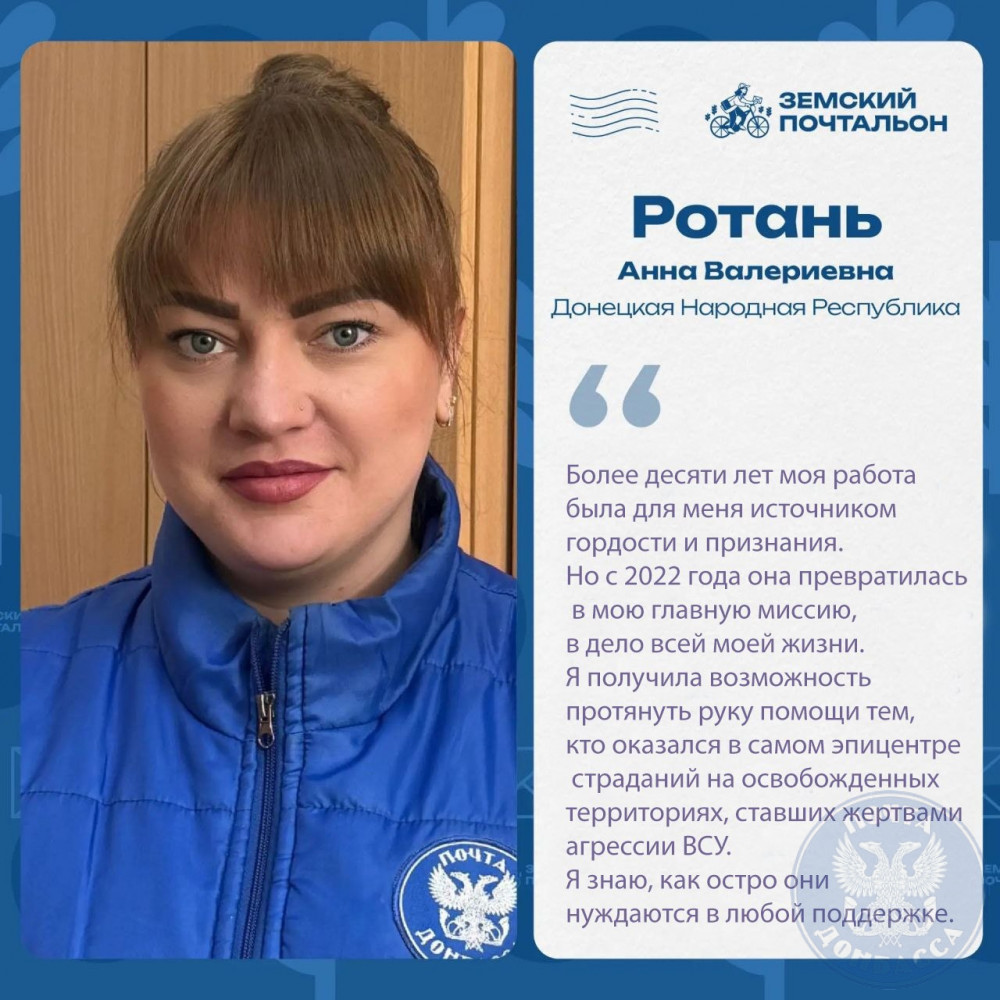 Анна Валерьевна проявляет исключительную самоотдачу, ежедневно отправляясь на освобожденные территории для выполнения критически важных задач: выплаты пенсий и социальных пособий, доставки почтовых отправлений и корреспонденции, а также обеспечения жителей необходимыми товарами.